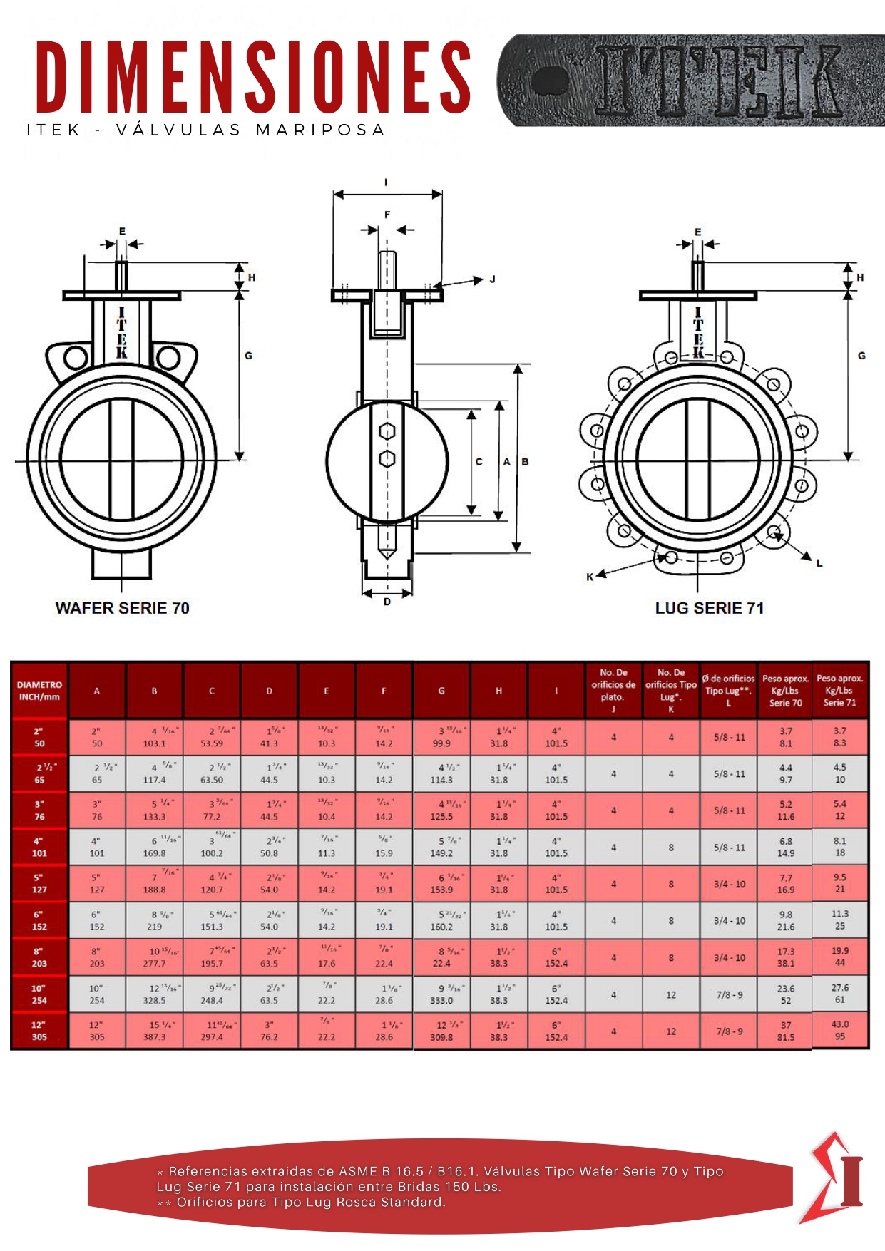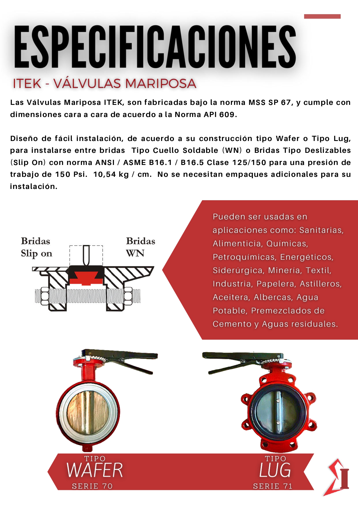 «50mm – 12» 300mm) y Tipo Lug Serie 71 (2 «50mm – 12» 300mm) de ITEK son de cuerpo de una pieza y están fabricadas bajo los entandares más altos de la industria requiere.